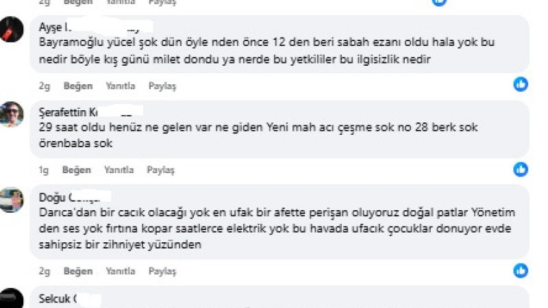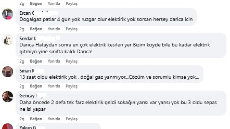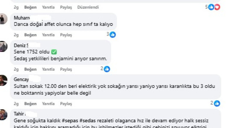 “Yıllardır kabloların yer altına alınamamış olması bu kadar zor olmamalı.Faturaya gelince koşa koşa yazanlar hizmette sınıfta kalıyor...”, “Darıca doğal affet olunca hep sınıf ta kalıyor”, “Sene 1752 oldu Sedaş yetkilileri benjamini arıyor sanırım.”, “Sultan sokak 12.00 den beri elektirik yok sokağın yarısı yaniyo yarısı karanlıkta bu 3 oldu ne boktannis yapiyolar belle değil”, “Gene soğukta kaldık #sepas #sedas rezaleti olağanca hız ile devam ediyor halk sessiz kaldığı için hakkını aramadığı için bu isbilmezler istediği gibi cebinizi soyuyor elktrigi gazı kesiyor ihnalsizliklre kurbanda versek bu millet susuyor ölü toprağı serpilmiş sanki üstlerine”, “#Gökayfatihdanacı Sen bu sedaş'ı yönetemiyorsun, İstifa et bence”, “Saat 3den beri elektirk yok evler buz kestiii”, “Darıca bağlarbaşında saat 11:00’den beri elektrik yok bu Sedaş ne iş yapar”, “Bayramoğlu yücel şok dün öyle nden önce 12 den beri sabah ezanı oldu hala yok bu nedir böyle kış günü milet dondu ya nerde bu yetkililer bu ilgisizlik nedir”, “29 saat oldu henüz ne gelen var ne giden Yeni mah acı çeşme sok no 28 berk sok örenbaba sok”, “Darıca'dan bir cacık olacağı yok en ufak bir afette perişan oluyoruz doğal patlar Yönetim den ses yok fırtına kopar saatlerce elektrik yok bu havada ufacık çocuklar donuyor evde sahipsiz bir zihniyet yüzünden”, “Darica semti ufak yagmur kar kış olduğu zaman hafif gök gürledigi zaman elektrikte suda hemen gidiyor ne alaka anlamadik çok saçma bu konuda darica büyük.bır .O.O.O Kocaman O Ve Devamı da Gelecek Ben Buradayım Adım Gıbı Eminim, Osmangazi mahallesinde de gündüz 11 den beri yok halen evler buz gibi” , “Dogalgaz patlar 4 gun yok ruzgar olur elektirik yok sorsan hersey Darıca için”