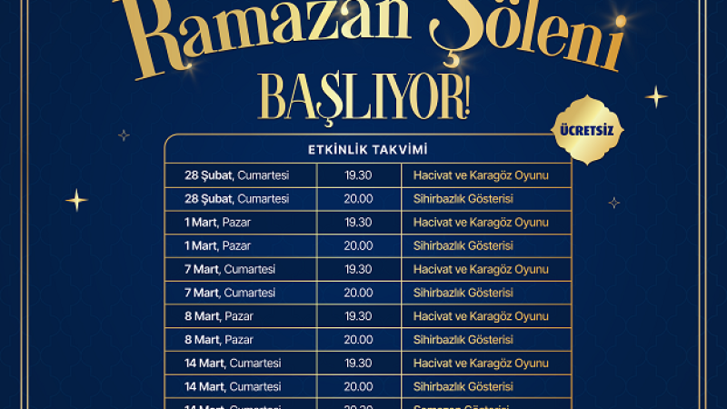 “Ramazan Şöleni” kapsamında her hafta sonu gerçekleştirilecek programda; Hacivat & Karagöz sahne oyunu, sihirbazlık gösterileri, ney dinletisi ve semazen gösterileri yer alacak. Ramazan akşamlarının vazgeçilmez geleneksel eğlenceleri hem çocuklara hem de yetişkinlere keyifli anlar yaşatacak.